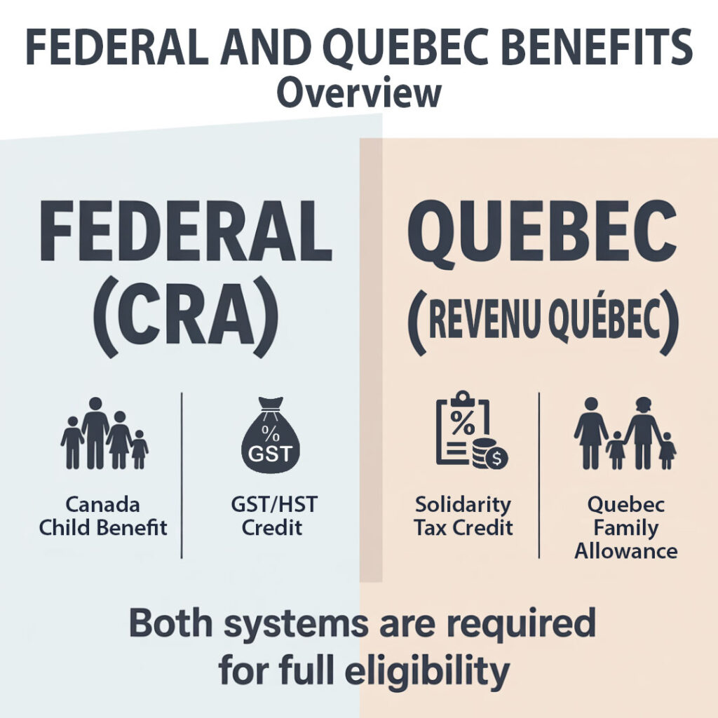 Federal and provincial benefits are administered separately. Programs like the Canada Child Benefit and GST/HST credit are federal, while the Quebec Family Allowance and Solidarity Tax Credit come from Revenu Québec. You need accounts with both agencies and filed tax returns to receive the full range of payments.