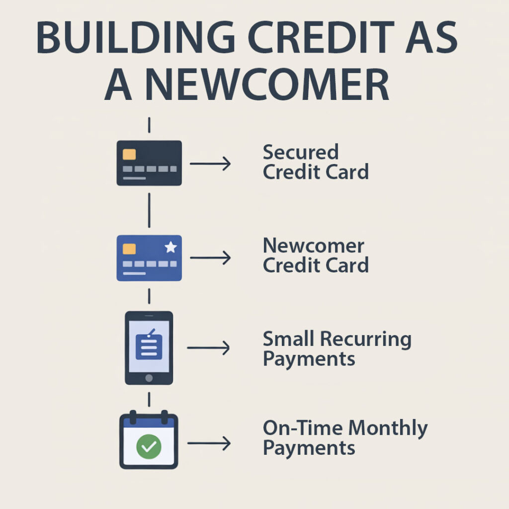 A bank account alone is insufficient. Newcomers should build Canadian credit early, as landlords, phone companies, and lenders all perform credit checks.